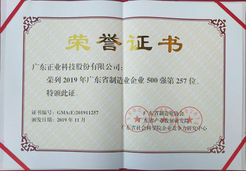 【喜訊速遞】正業科技榮列2019年廣東省制造業企業500強