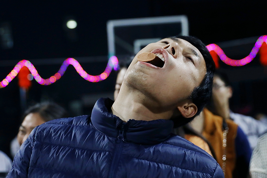第二個游戲環節是“擠眉弄眼”。這個游戲的規則是頭朝上,額頭放置山楂片一塊,然后選手運用自己的臉部的五官靠肌肉扭動把山楂片從額頭移到嘴里,是一個既好玩又好吃的游戲,最后由風控中心/管理中心/市場中心組成的群英隊獲得了“擠眉弄眼”的冠軍。