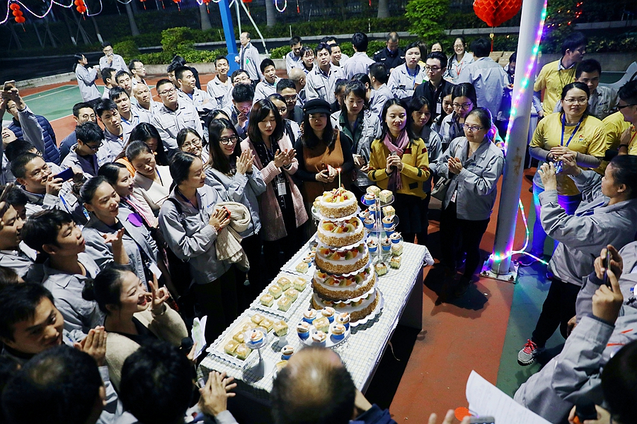 正業科技二十周年系列活動——“歡聚一堂,共慶雙旦”暨第四季職工生日會于2017年12月28日晚上在公司籃球場隆重舉行,技術中心總監梅領亮、市場中心總監徐同、董事會秘書王巍、管理中心總監黃洪輝、人力資源總監嚴敏升與正業科技總部500多名員工一起,共同歡度了這個開心難忘的夜晚。