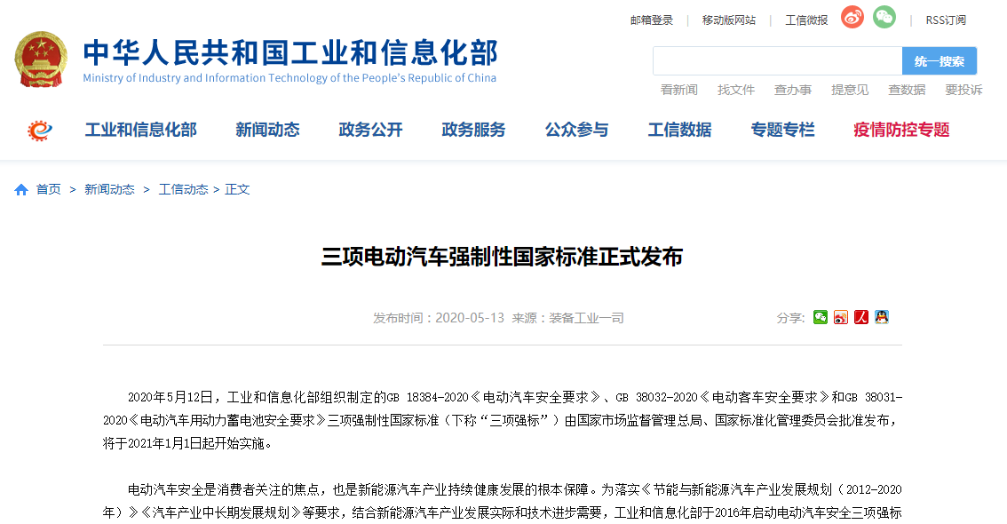 2020年5月12日,工業(yè)和信息化部組織制定的GB 18384-2020《電動汽車安全要求》、GB 38032-2020《電動客車安全要求》和GB 38031-2020《電動汽車用動力蓄電池安全要求》三項(xiàng)強(qiáng)制性國家標(biāo)準(zhǔn)由國家市場監(jiān)督管理總局、國家標(biāo)準(zhǔn)化管理委員會批準(zhǔn)發(fā)布,進(jìn)一步提高和優(yōu)化了對電動汽車整車和動力電池產(chǎn)品的安全技術(shù)要求。